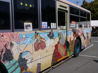 東京芸術大学の学生が直接車体に「巌流島の決闘」を描いた色鮮やかなデザインバスと子ども達が綱引き!